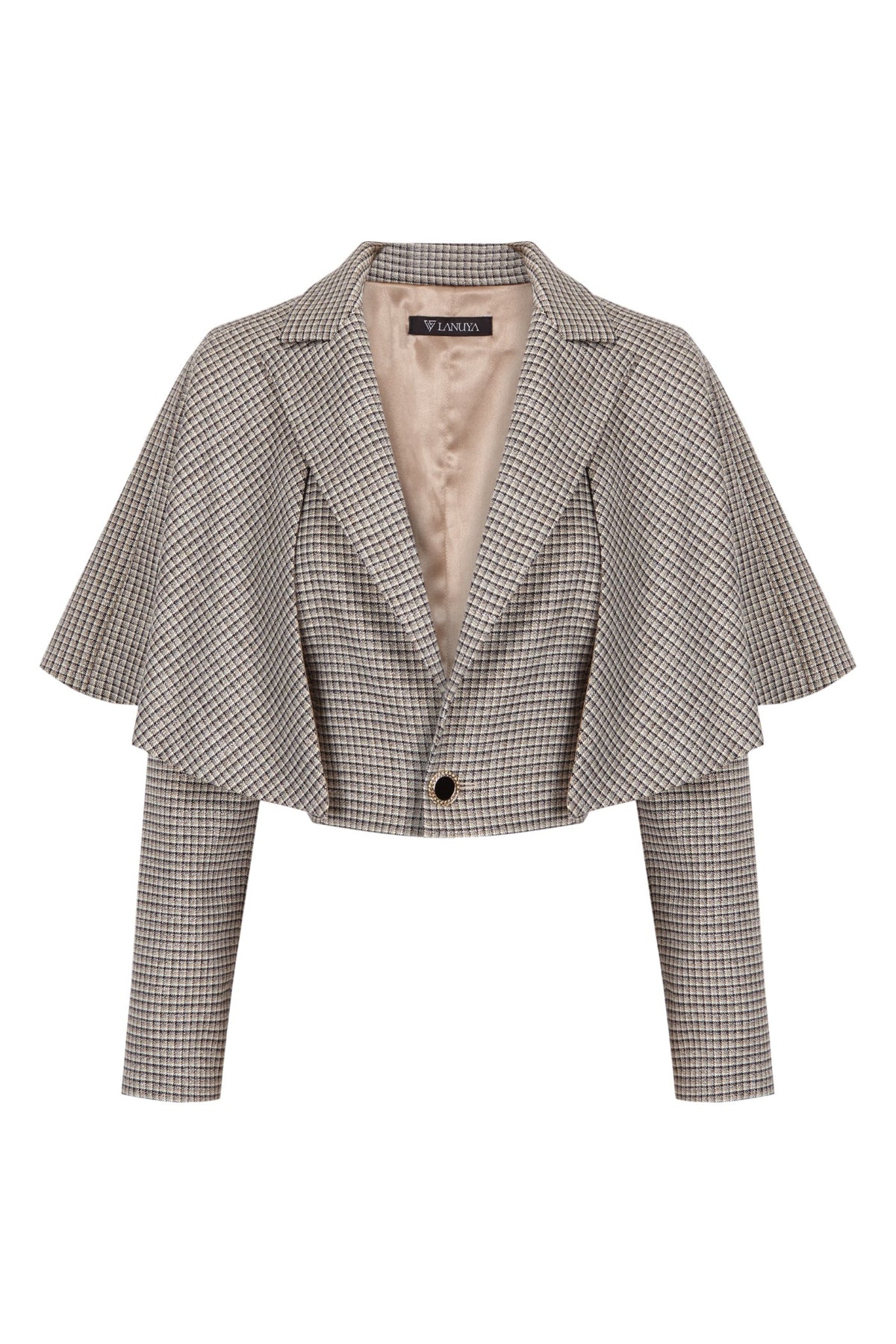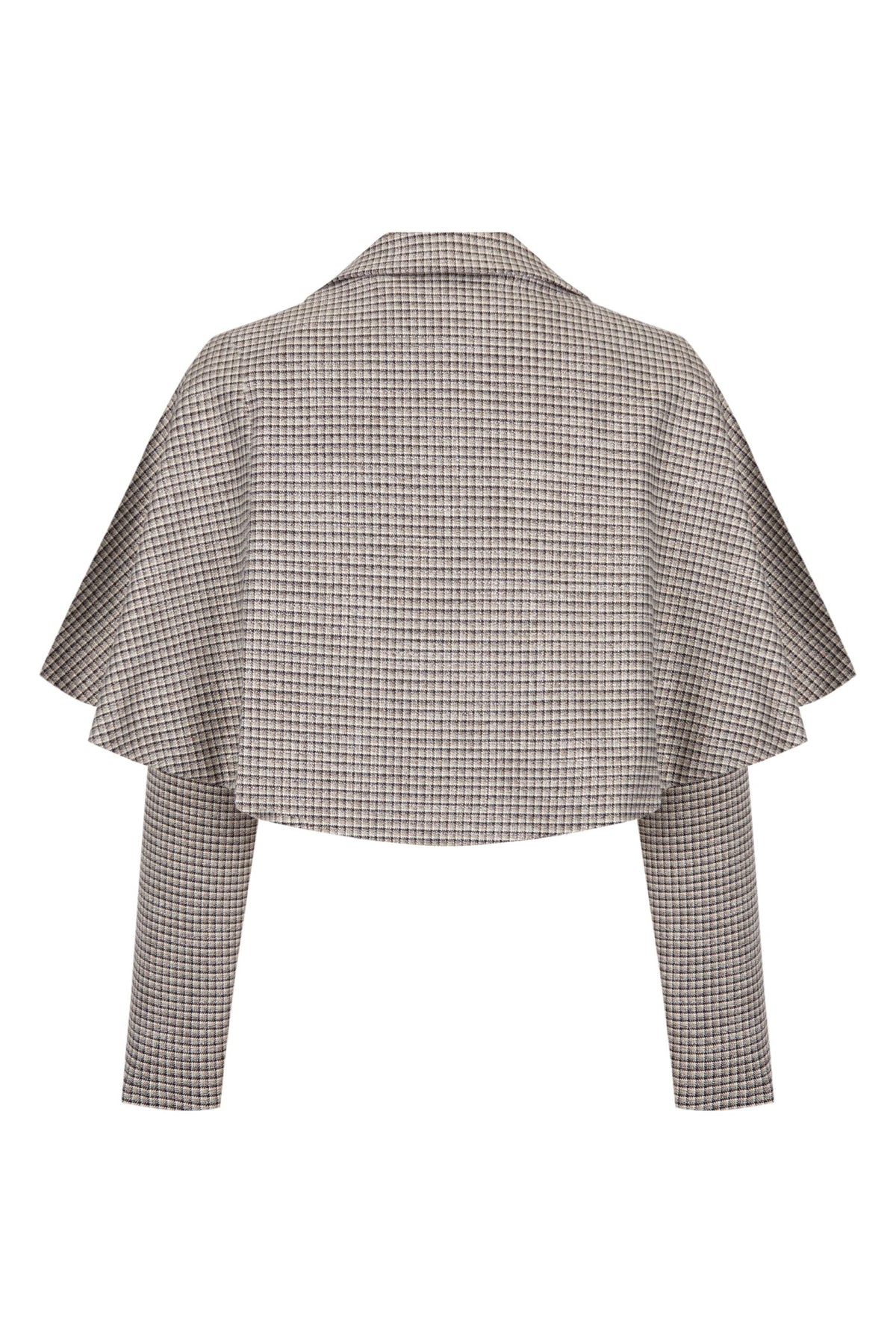 Short beige cape jacket in houndstooth fabric that adds texture and character. With a lapel collar and double-breasted closure, it combines structure and fluidity in a contemporary silhouette. A garment with its own style to enhance your seasonal looks.