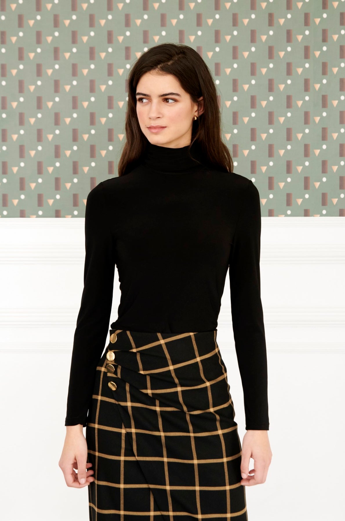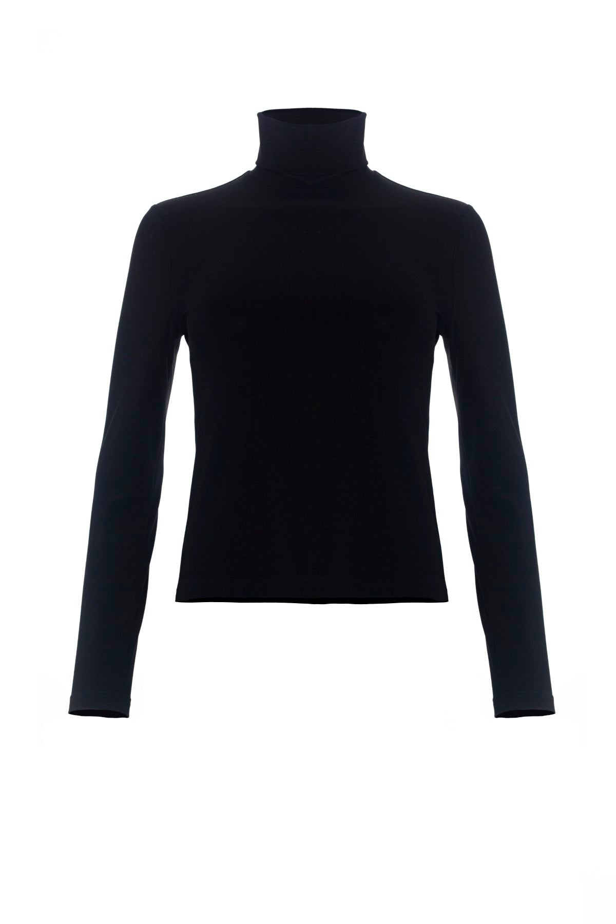 Jersey negro de manga larga y cuello alto con diseño ajustado que realza la silueta. Su tejido suave y elástico ofrece comodidad y un estilo moderno y minimalista. Ideal para combinar con prendas formales o casuales, aportando elegancia y versatilidad a cualquier look.