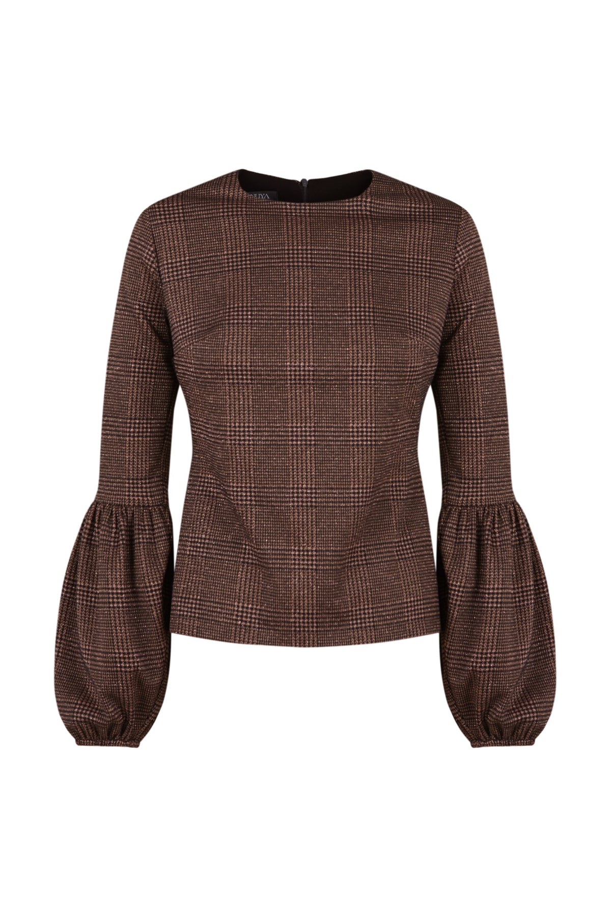 Elegant stretch top featuring a sophisticated houndstooth print in brown and black. With long puff sleeves and a fitted waist, it offers a feminine and streamlined design. Its classic round neck adds a timeless touch.