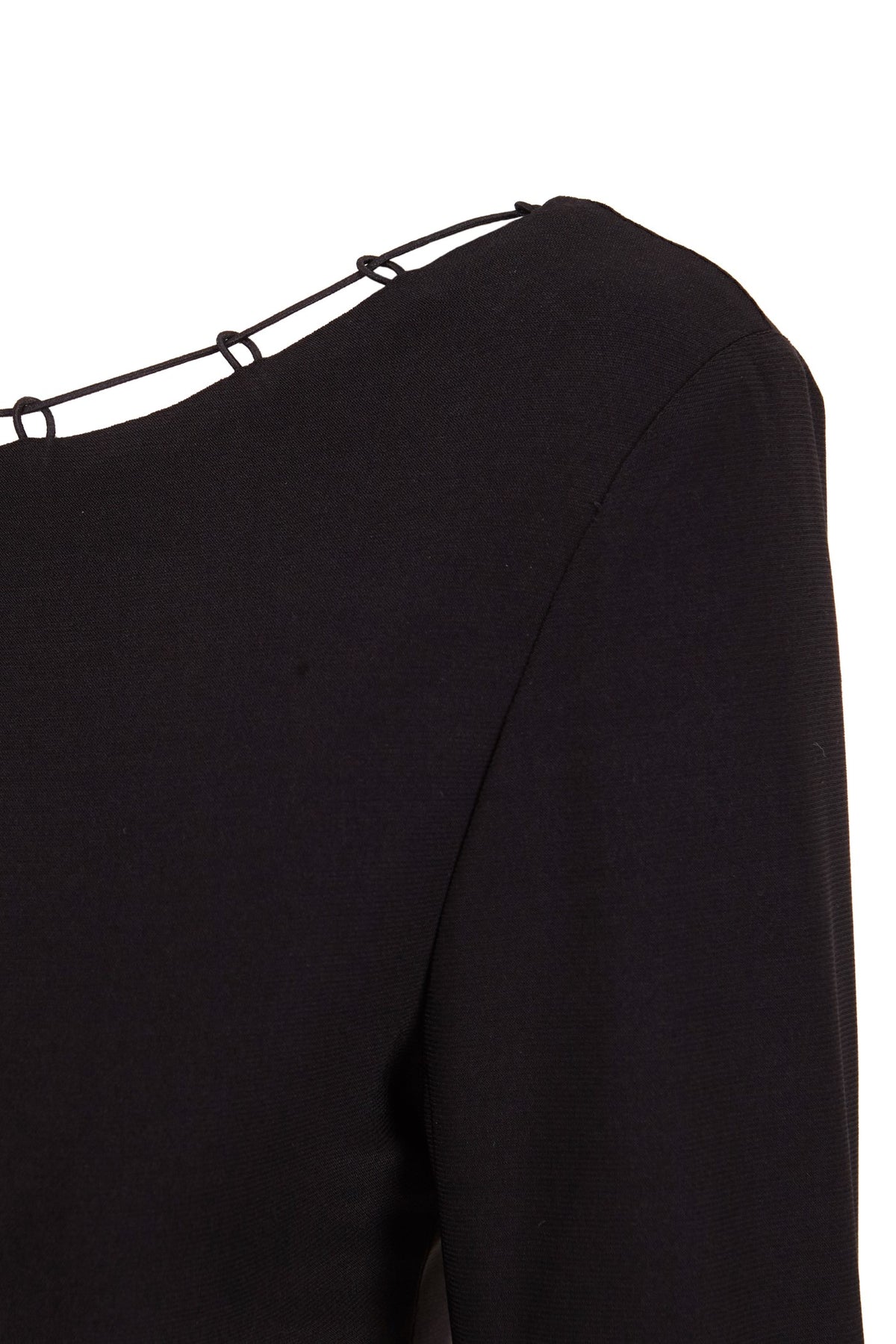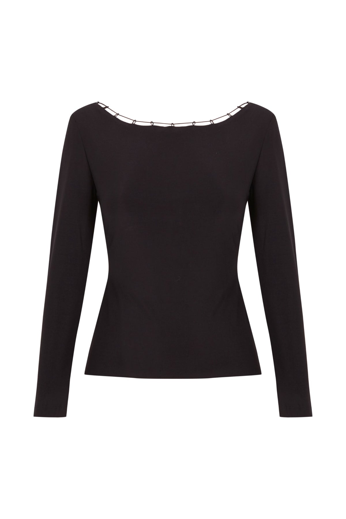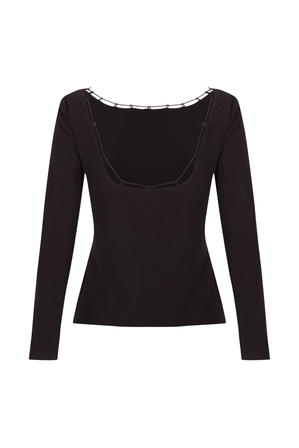 A fitted black top with an elegant bateau neckline that highlights the shoulders. The back features a striking scoop neckline adorned with a decorative lace that runs all the way around, adding a sensual and sophisticated touch. Ideal for statement evening looks.