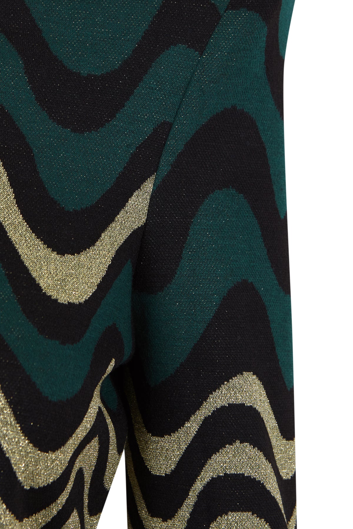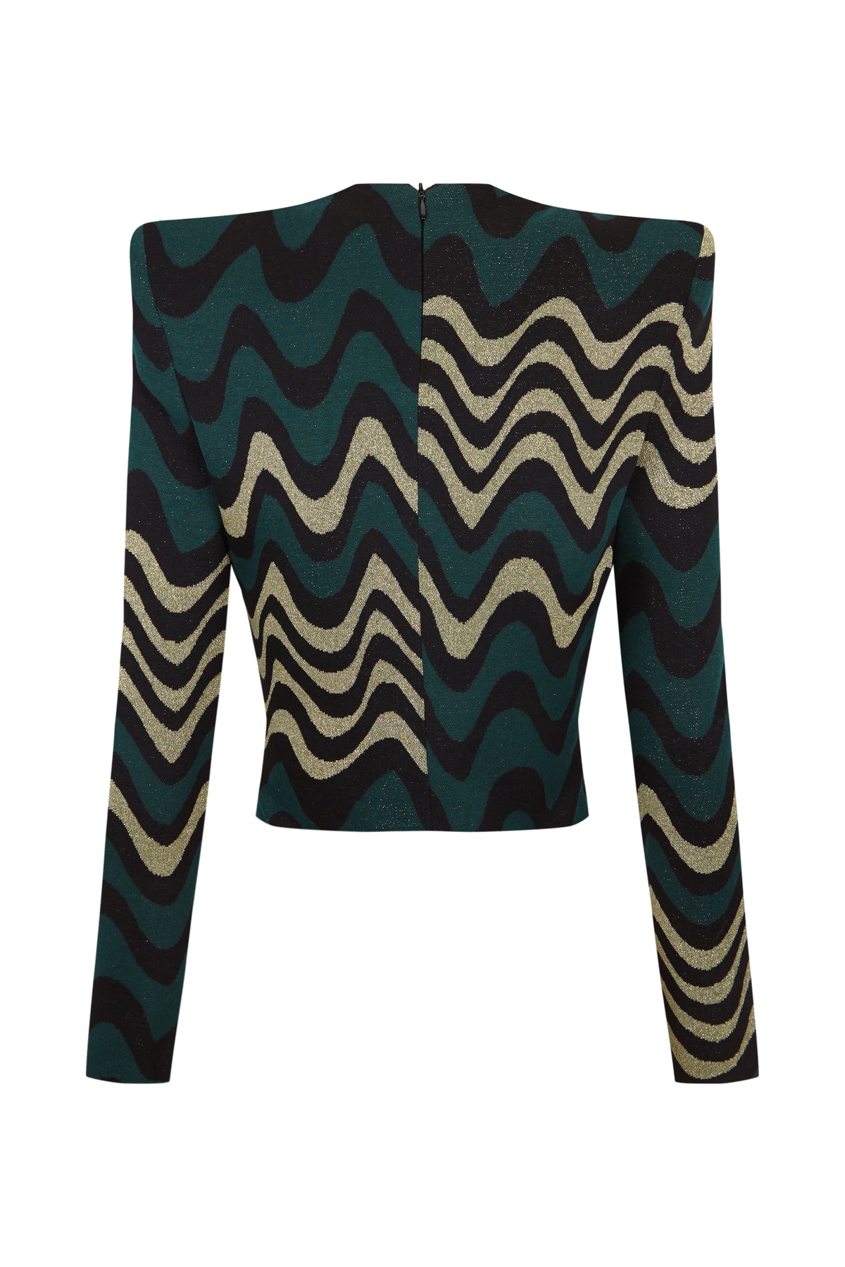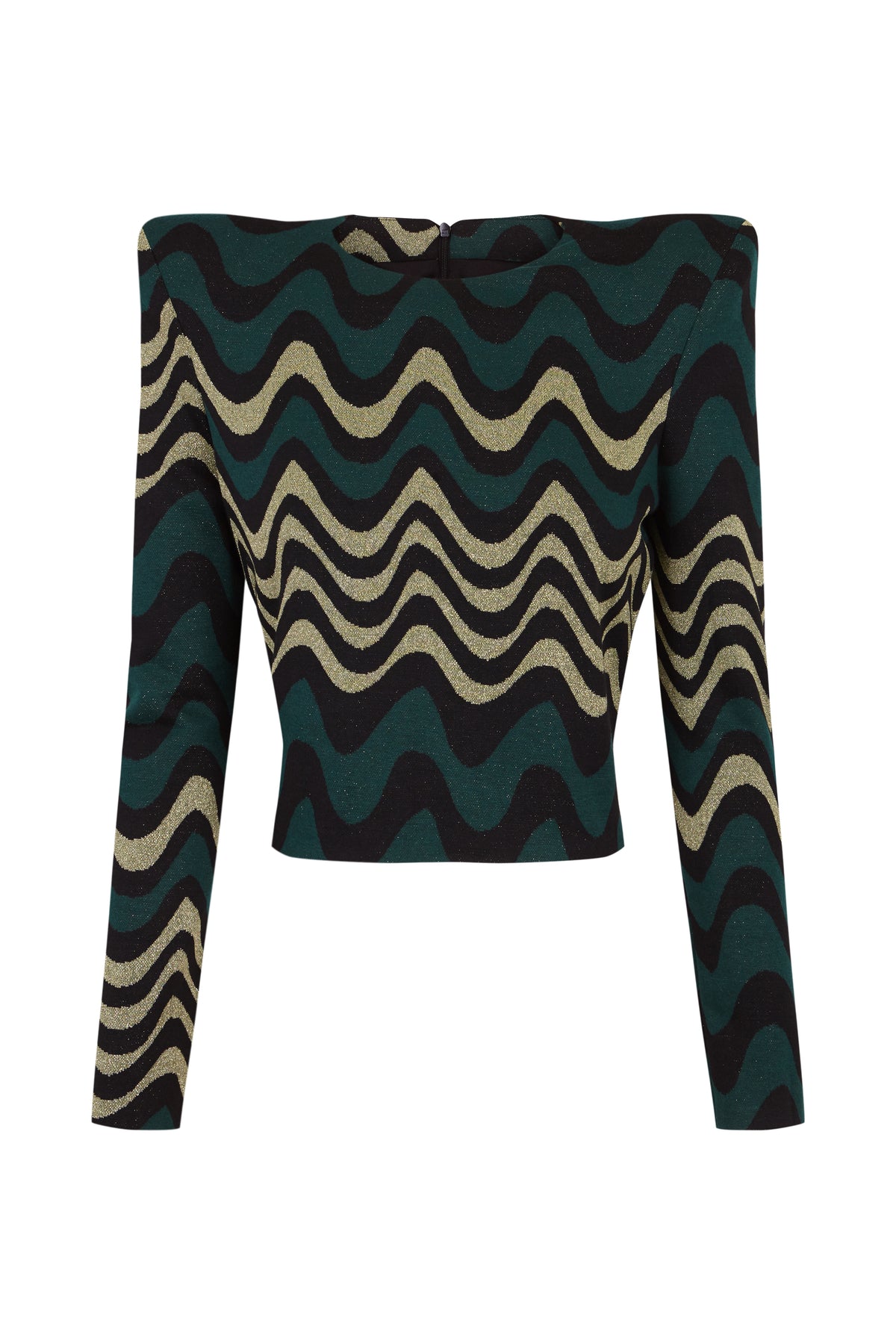 Top de punto con diseño ondulado en verde, dorado y negro que aporta modernidad y movimiento. De manga larga y corte ajustado, realza la figura con comodidad gracias a su tejido suave y elástico. Perfecto para combinar con faldas o pantalones de tiro alto y crear looks preferidos.