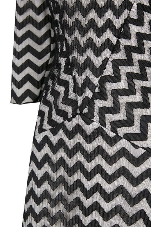 Midi dress made of mesh fabric with a striking black and white chevron pattern. It features a fitted waistline that flatters the feminine figure, and a flared skirt that provides movement and fluidity. The round neckline and three-quarter sleeves give it a classic and sophisticated look.