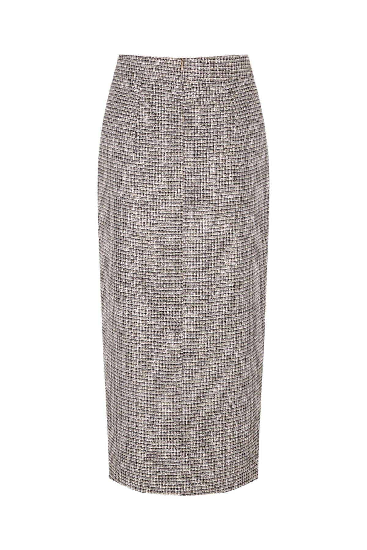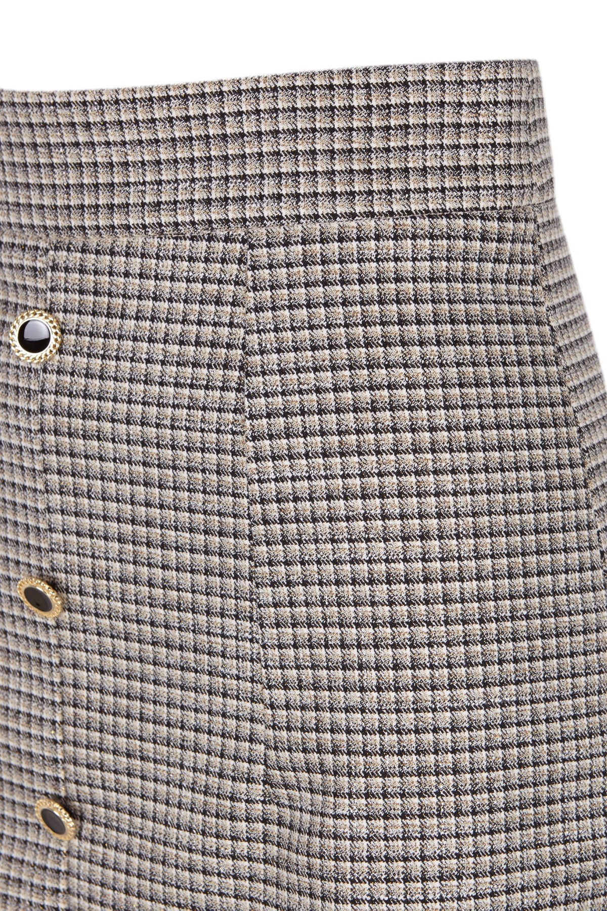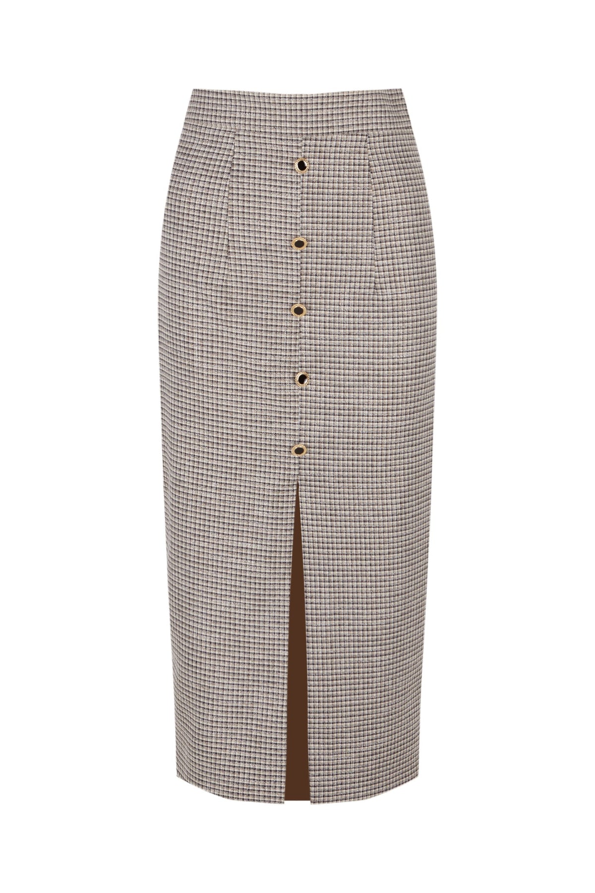 Falda midi confeccionada en tejido con estampado de pata de gallo que añade textura y sofisticación. Su diseño entallado y su cierre frontal de botones la convierten en una pieza versátil que puedes combinar tanto con blusas como con jerséis.