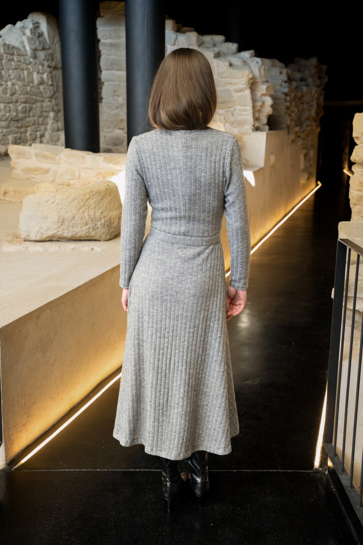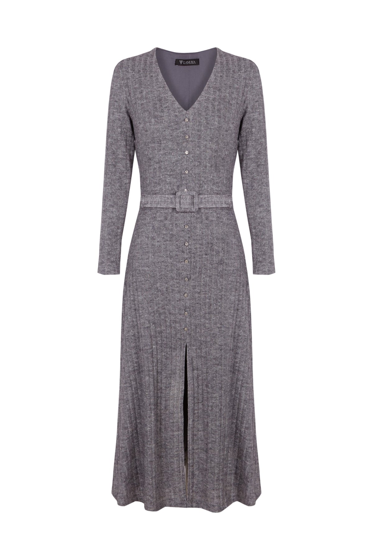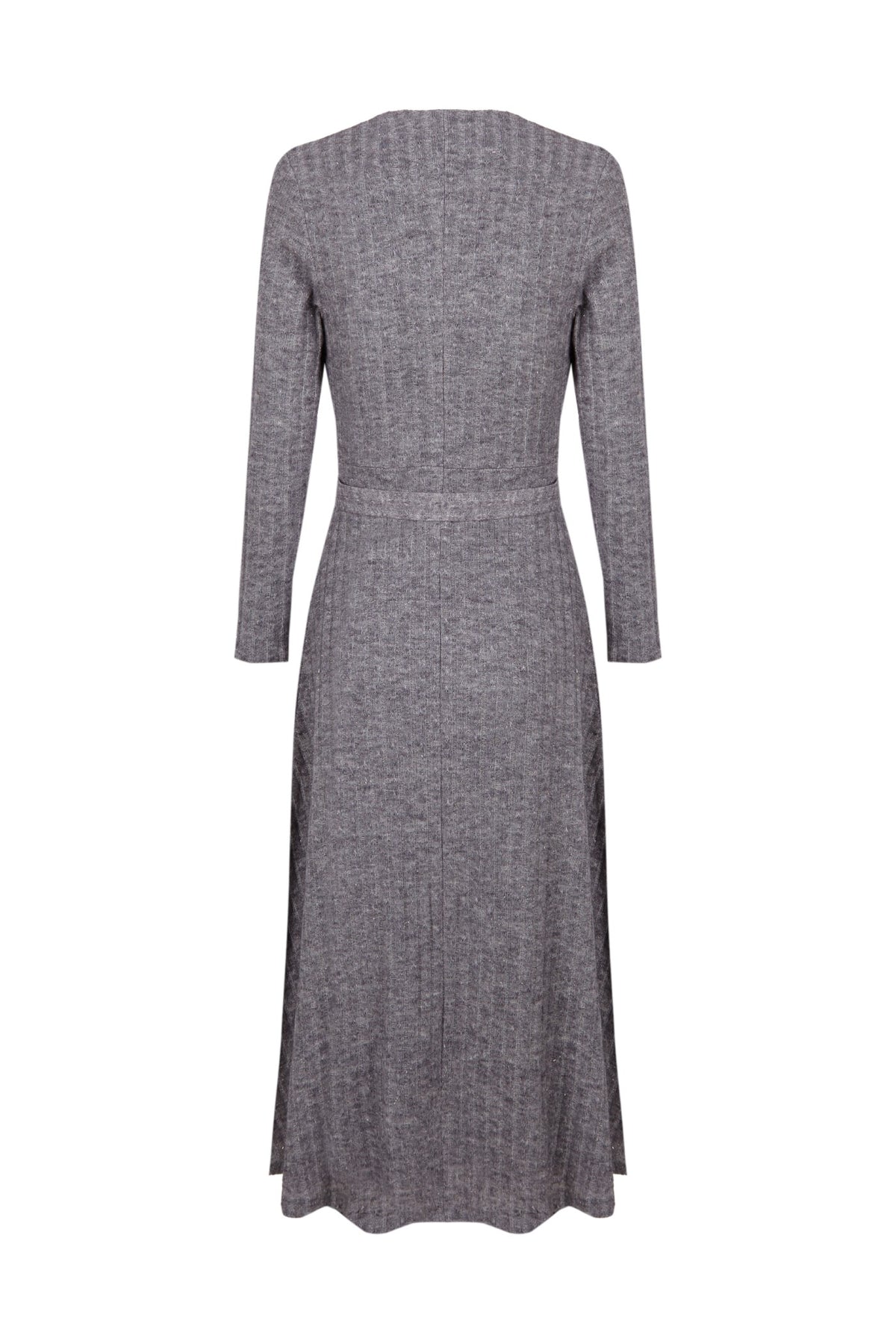 Vestido de punto gris, suave y ligero, que se adapta al cuerpo con comodidad y estilo. Su diseño versátil se completa con cinturón a juego y botones plateados que aportan un toque de luz y sofisticación. Ideal para acompañarte con elegancia en cualquier momento del día.