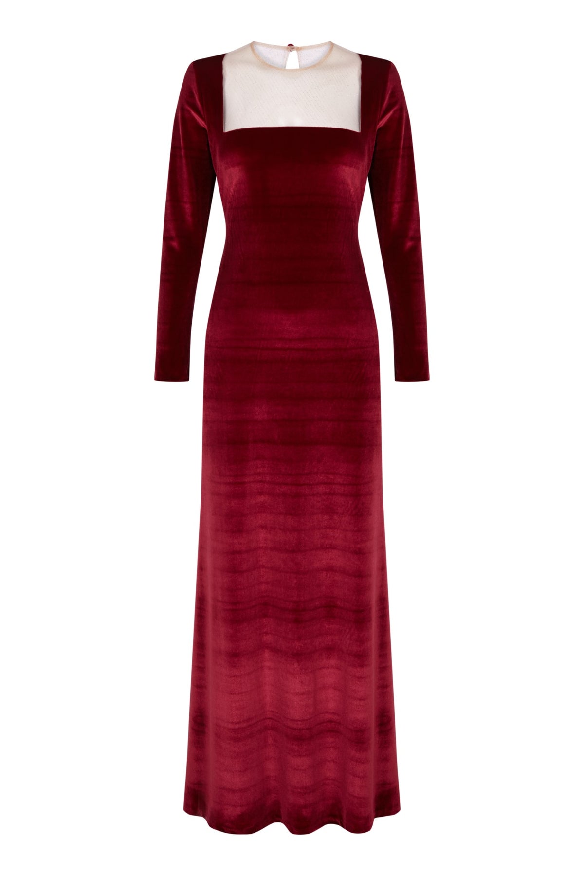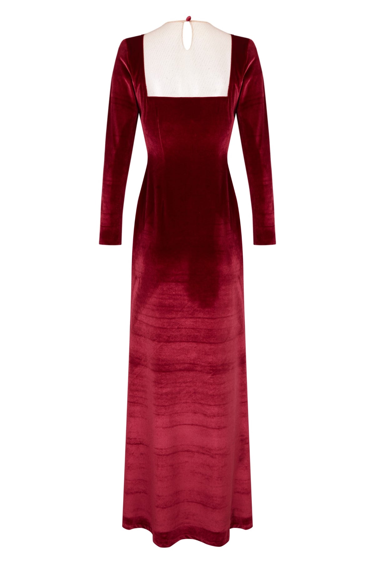 Vestido largo de terciopelo rojo burdeos con brillo sutil que irradia elegancia. Su cuello cuadrado y mangas largas crean una silueta clásica y atemporal, mientras que el corte entallado realza las curvas femeninas. Una pieza cálida y sofisticada, perfecta para ocasiones especiales.