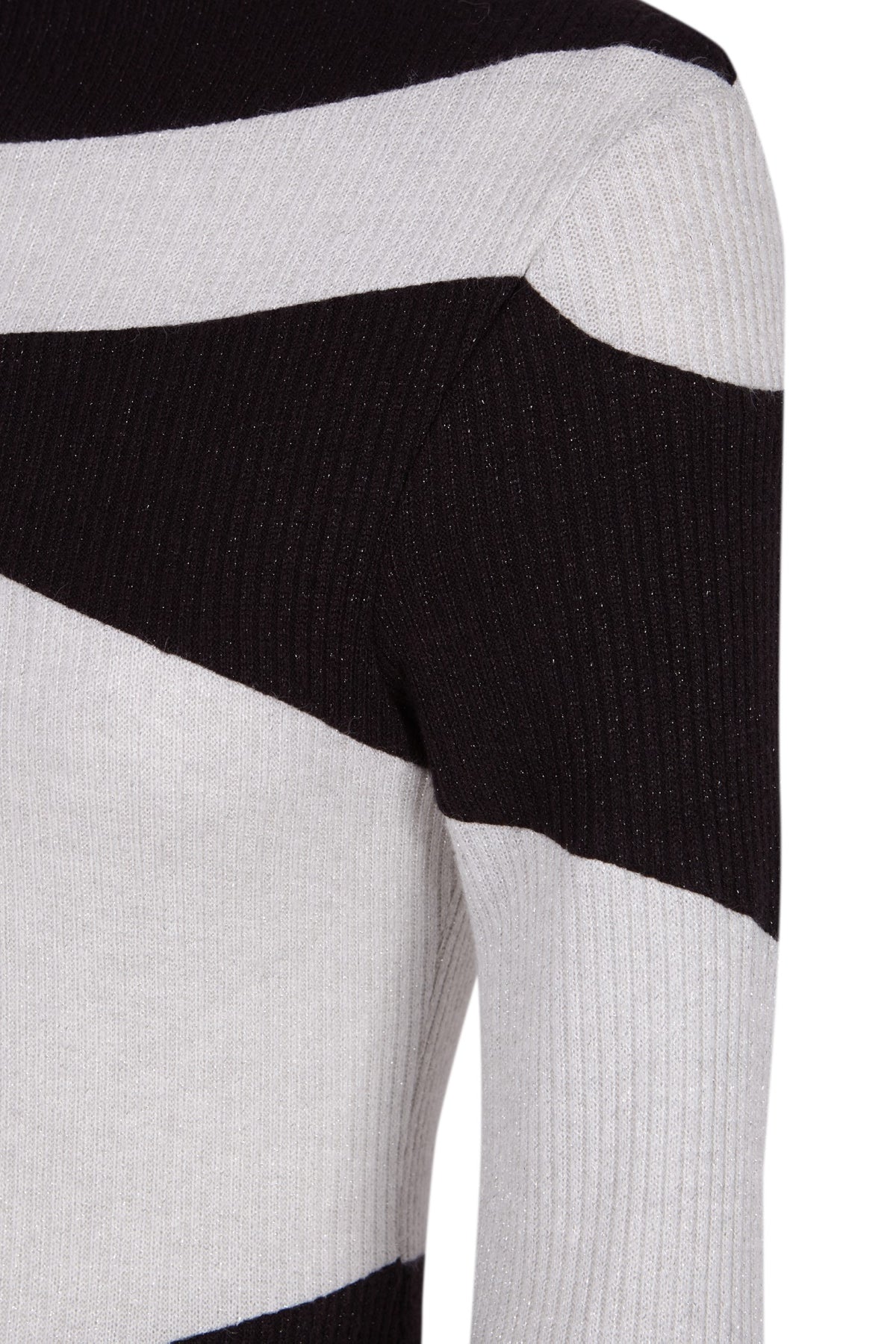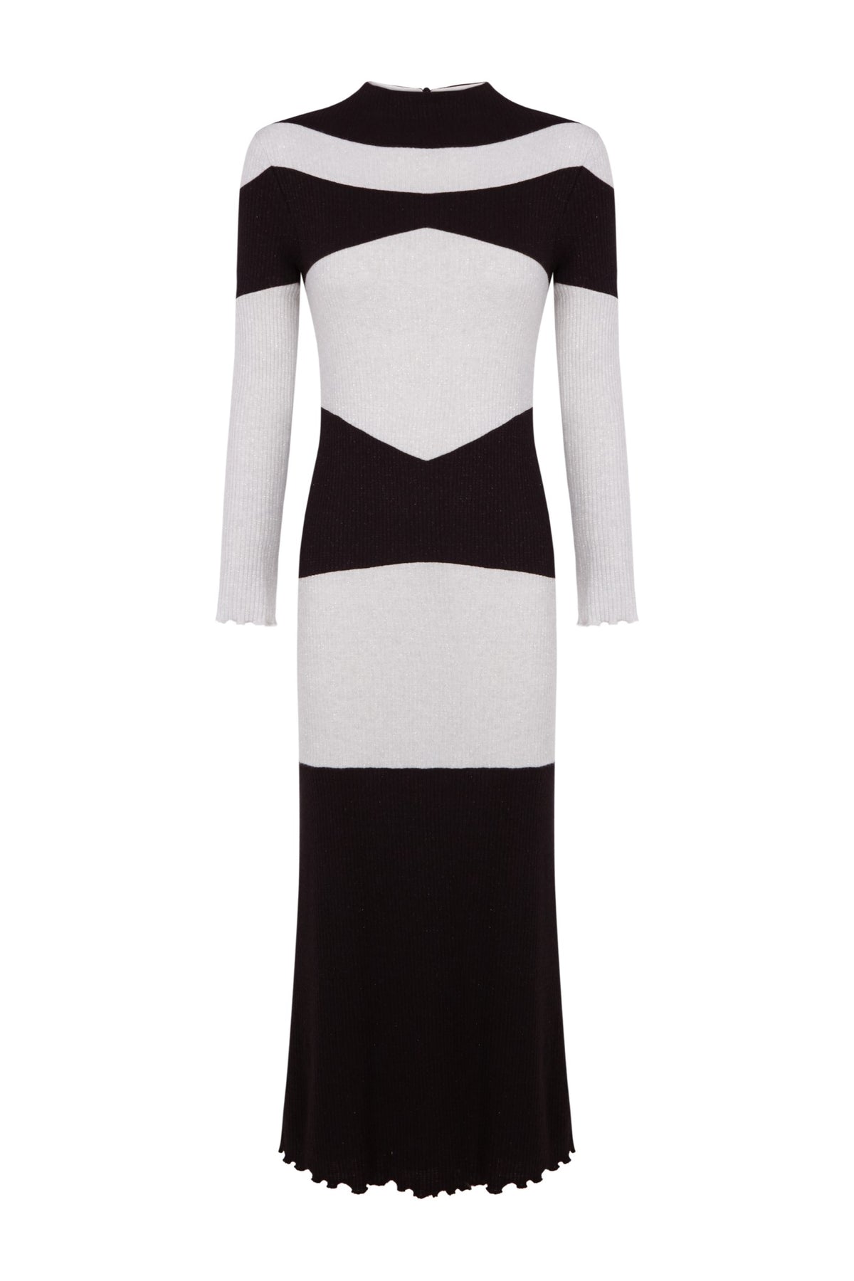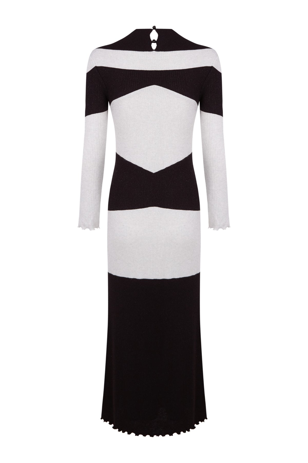 Vestido midi negro y gris perlado confeccionado en tejido de punto brilloso. Su diseño minimalista y su corte favorecedor acentúan la figura femenina, mientras que la manga larga y el cuello alto aportan un toque de elegancia. Los cortes y el cambio de color se ajustan perfectamente al cuerpo de la mujer favoreciéndolo.