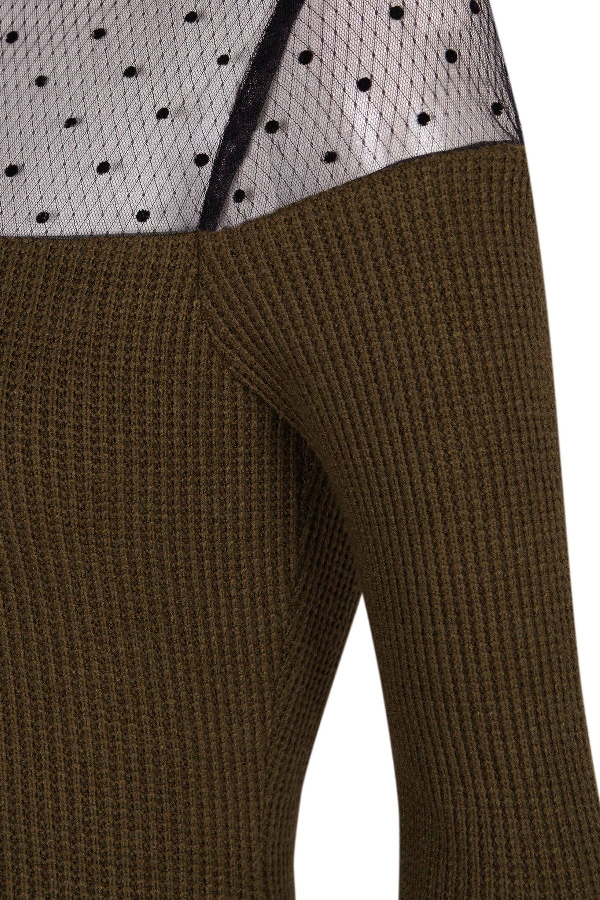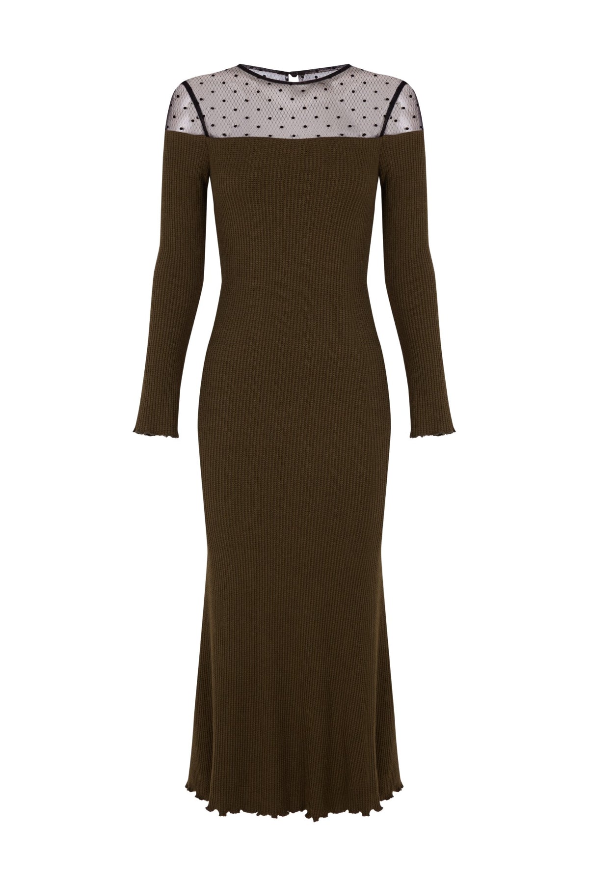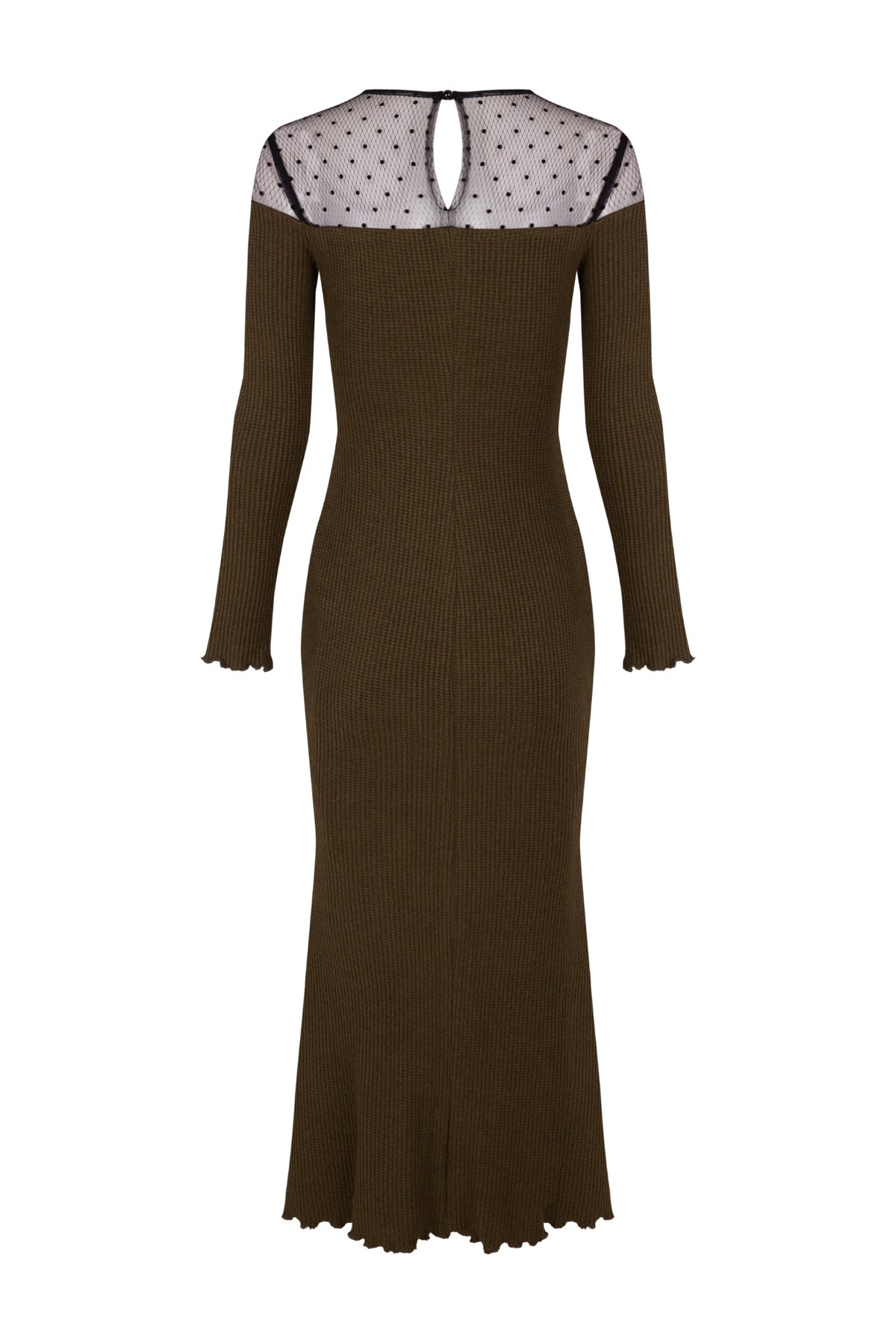 Vestido midi ajustado en dos tejidos que combina elegancia y modernidad. Su escote a la caja con tul transparente y detalles de botones aporta un toque refinado y actual. Perfecto para eventos formales, es una pieza que une sofisticación atemporal con estilo contemporáneo.