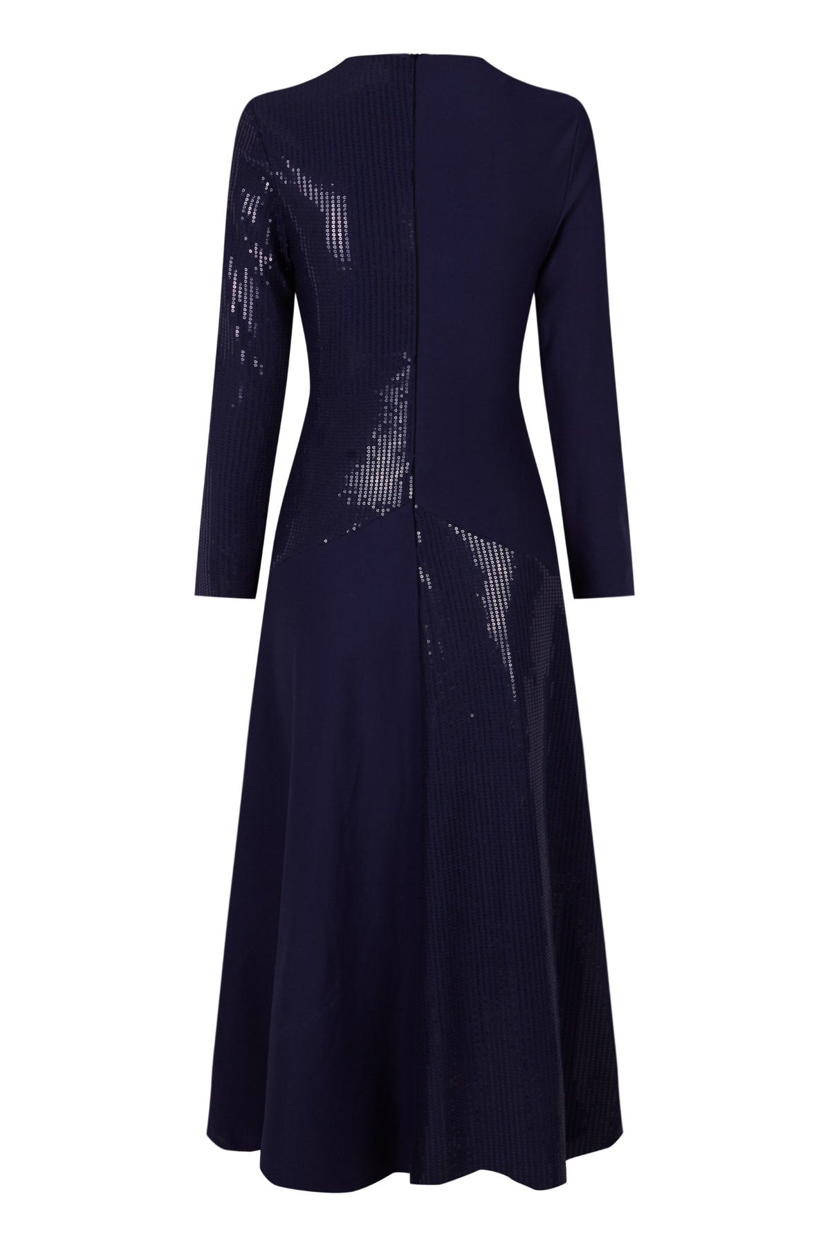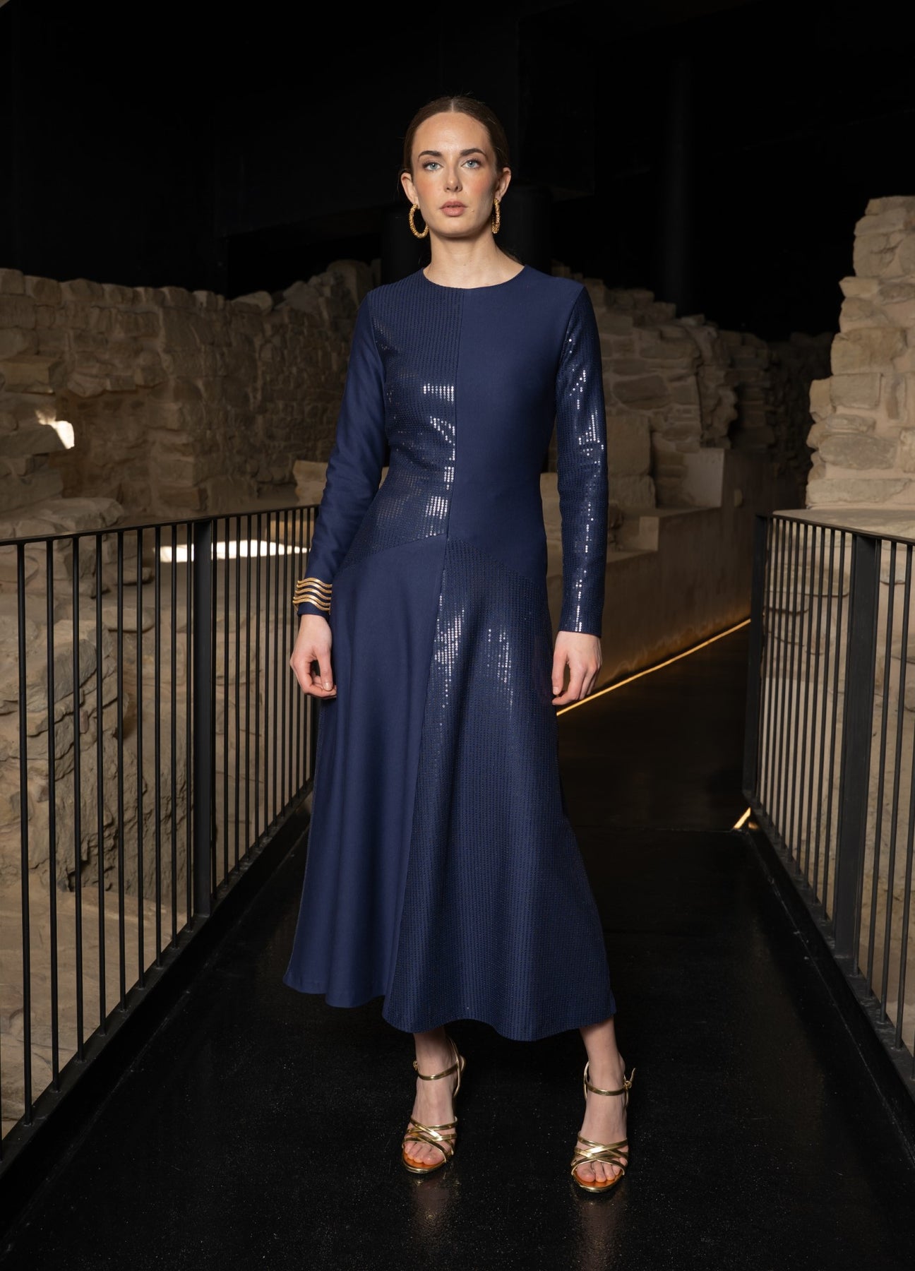 Vestido azul oscuro de punto y lentejuelas que combina sofisticación y calidez. Su escote redondo aporta un toque invernal, mientras que la falda con vuelo añade movimiento y elegancia. Ideal para brillar en noches de fiesta o eventos especiales con estilo.